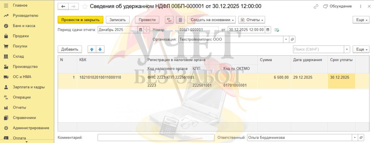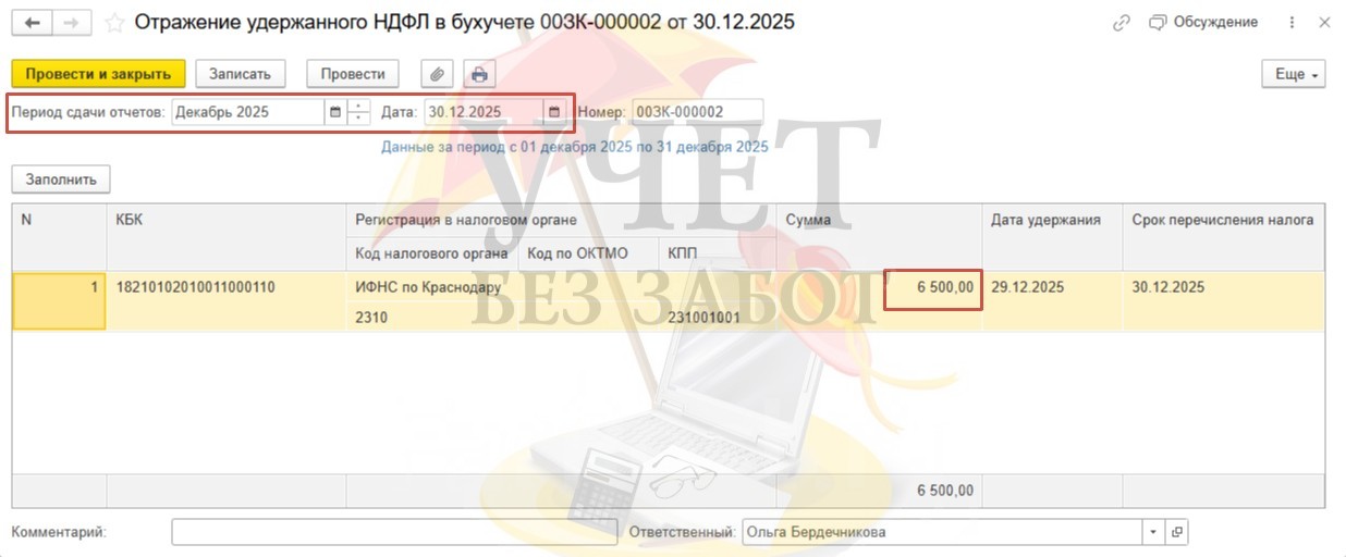 В разделе меню «Зарплата» перейдем к пункту «Отражение удержанного НДФЛ в бухучете». Зарегистрируем новый документ. В поле «Период сдачи отчетов» выберем «Декабрь 2025». Дата формирования документа – 30.12.2025.