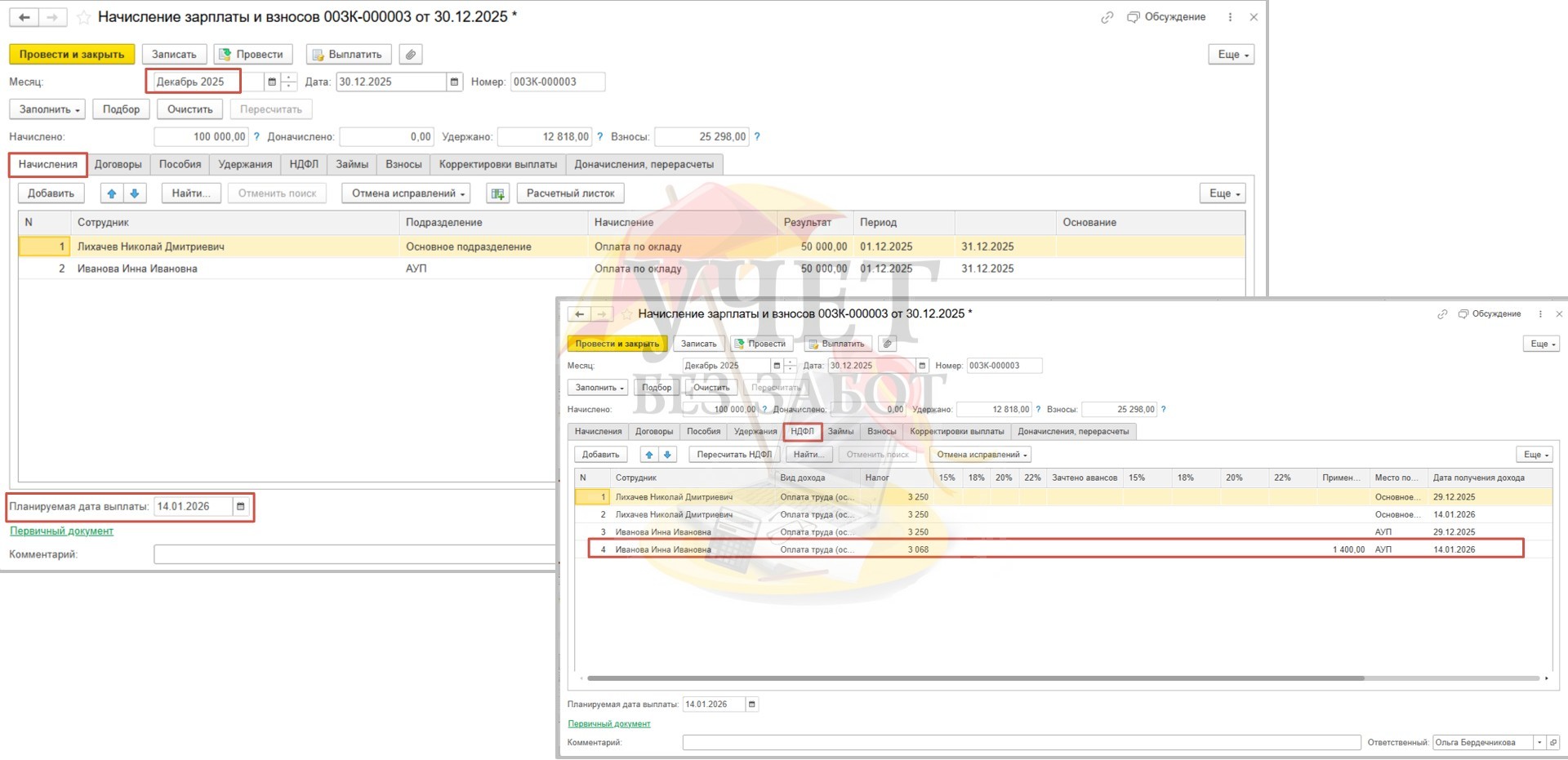 Условия примера: в ООО «Техстройкомплекс» установлены сроки выплаты декабрьской заработной платы: расчет за первую половину месяца – 29.12.2025г, окончательный расчет – 14.01.2026г. Для сотрудницы Ивановой И.И. в программе зарегистрировано заявление на предоставление детского вычета в размере 1 400 руб. (сумма дохода за весь 2025 год не превышает лимит в размере 450 000 руб.). Для сотрудника Лихачева Н.Д. в программе зарегистрирован доход в виде стоимости новогоднего подарка в размере 5 000 руб. (дата выдачи подарка 30.12.25г, дата удержания НДФЛ – 14.01.2026г).