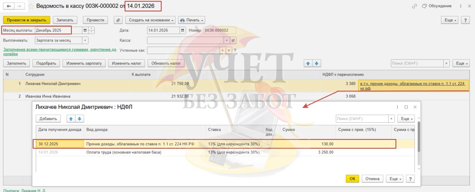 Далее сформируем ведомость на выплату в разделе меню «Выплаты» - «Ведомости в кассу» датой 14.01.26г. Обратите внимание, вместе с НДФЛ по окончательному расчету удерживается также налог, исчисленный со стоимости подарка.