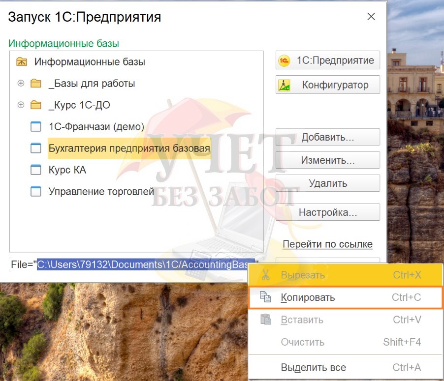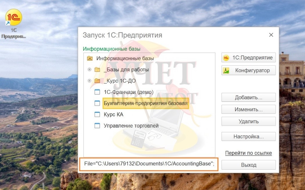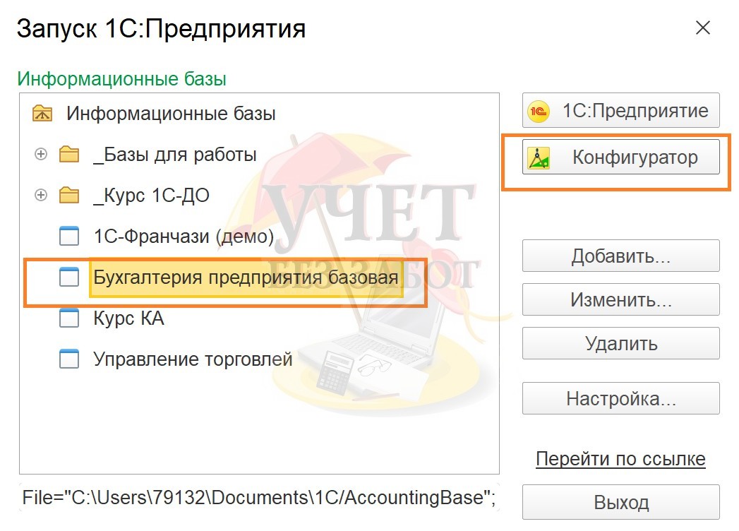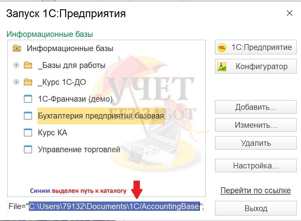 Для этого нужно запустить окно 1С со списком баз и выделить ту, для которой требуется создание резервной копии. Для примера нам требуется копия базы с названием «Бухгалтерия предприятия базовая». Снизу будет написан путь к каталогу, в котором находится база 1С.