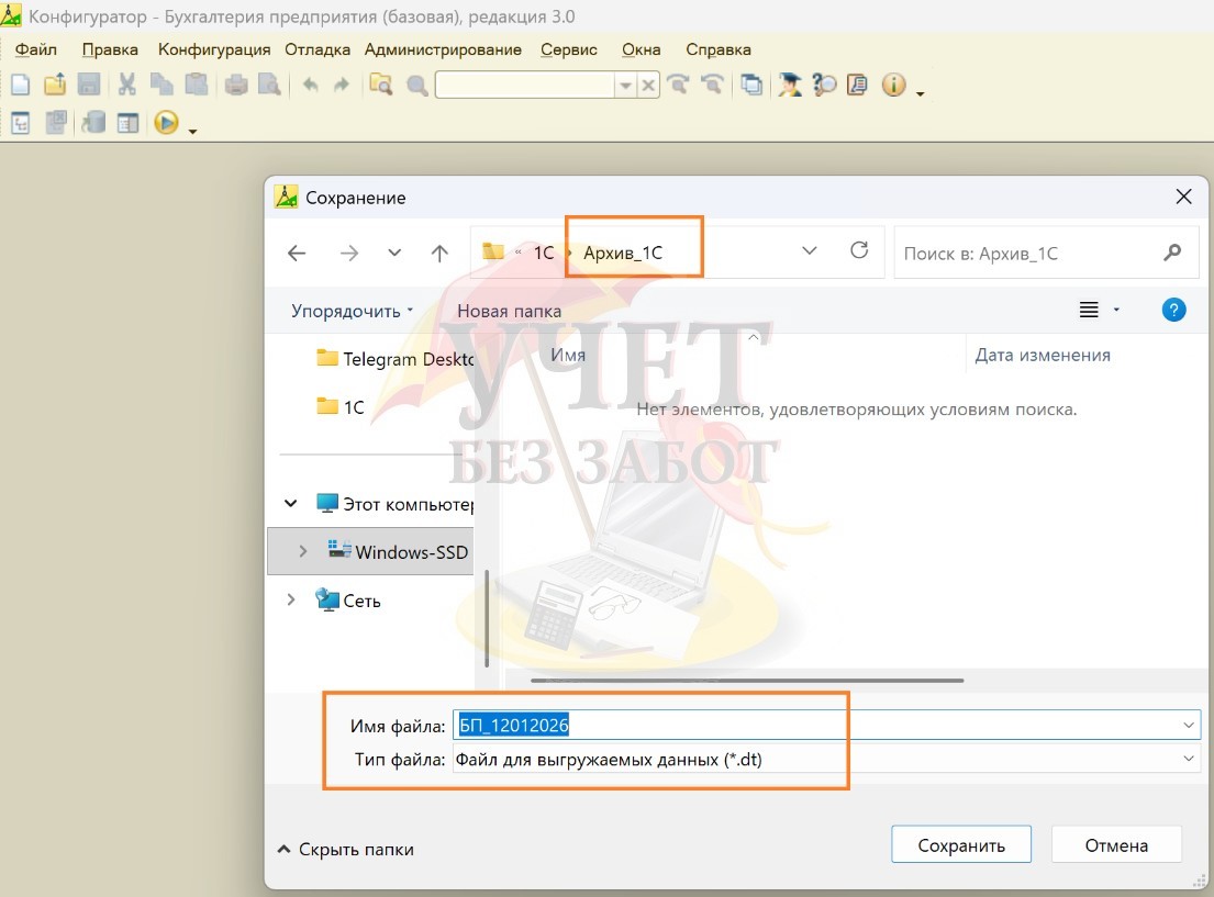 В результате откроется окно, в котором выбираем каталог для резервной копии, и называем нашу будущую резервную копию по шаблону «Имя базы_дата», например «БП_12012026». Нажимаем «Сохранить» и ждем завершение выгрузки.