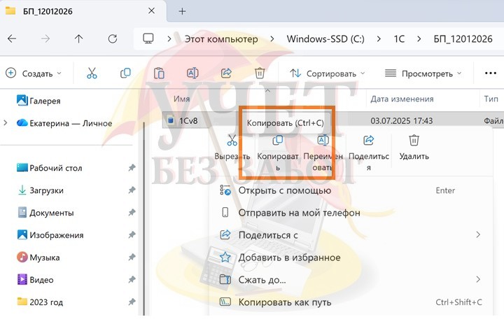 4. В каталоге с резервной копией нажимаем правой кнопкой мыши на файле 1Cv8 и выбираем команду «Копировать» или выделяем файл 1Cv8 и нажимаем сочетание горячих клавиш Ctrl+C.