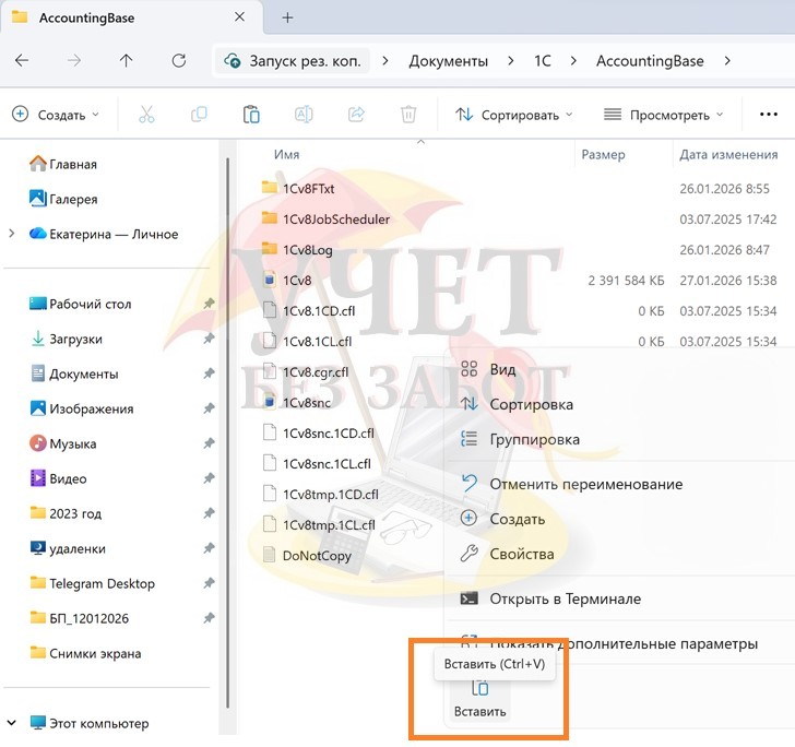 5. В каталоге с рабочей базой нажимаем правой кнопкой мыши в любом свободном месте в каталоге и выбираем команду «Вставить» или нажимаем сочетание горячих клавиш Ctrl+V.