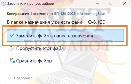 6. Отвечаем на контроль системы о замене файла «Заменить файл в папке назначения». В этом случае данные из резервной копии заменят данные из рабочей базы. Произойдет восстановление.