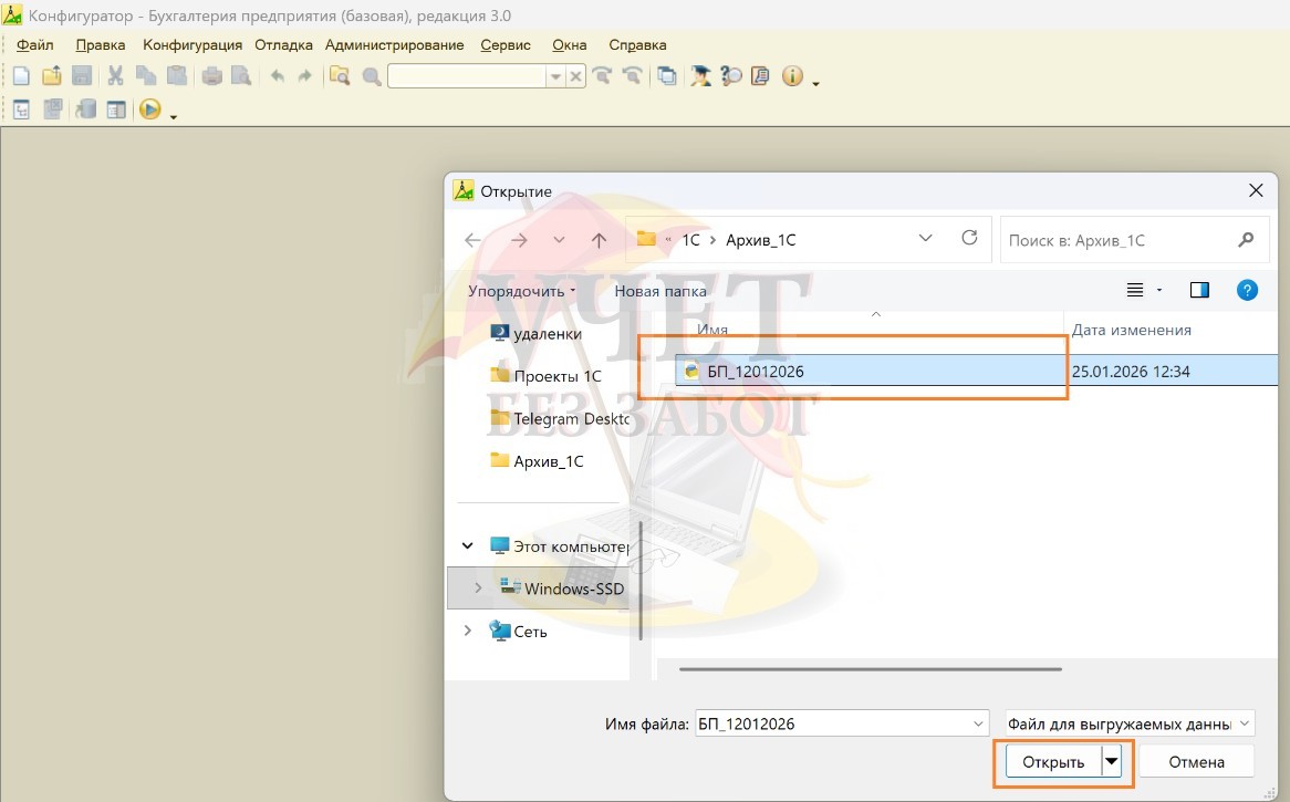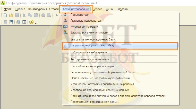 1. Открыть базу 1С в режиме «Конфигуратор» и воспользоваться командой в разделе меню «Администрирование» – «Загрузить информационную базу…».