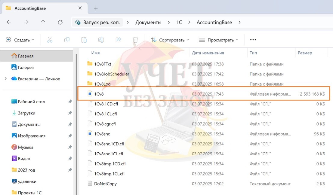 6. Нельзя менять название файла базы 1С в рабочем каталоге и в каталоге с резервной копией, выполненной путем копирования файла базы 1С средствами операционной системы. Файл базы всегда должен называться 1Cv8.
