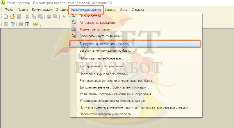 Для этого открываем раздел меню «Администрирование» – «Выгрузить информационную базу…».