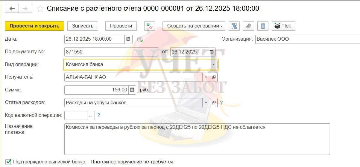 С 2026го года при автоматической загрузке через клиент-банк списания с расчетного счета, касающиеся банковских операций, также загружаются с типом «Комиссия банка».