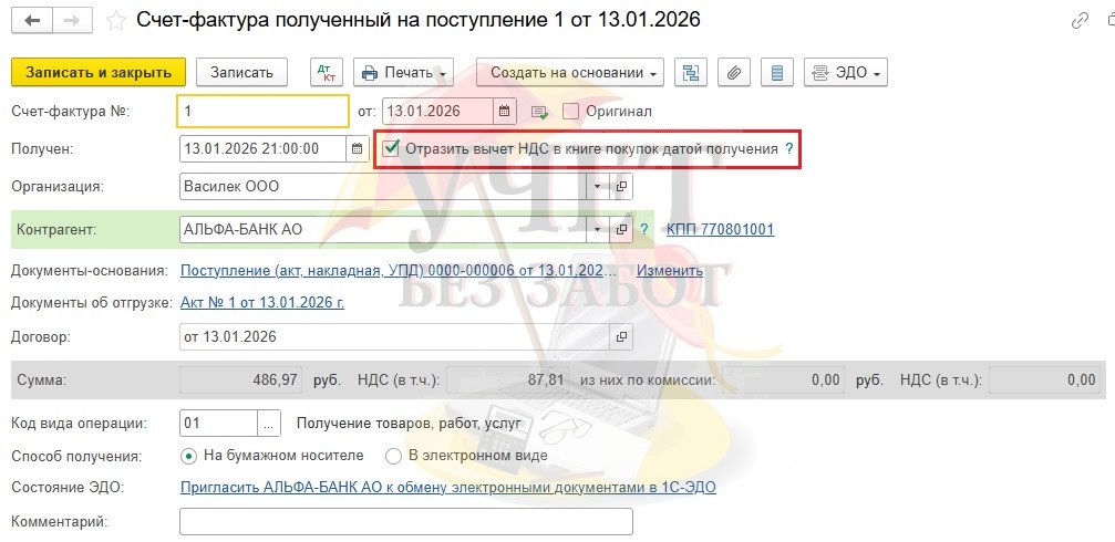 Провалившись в счет-фактуру проверяем наличие галочки «Отразить вычет НДС в книге покупок датой получения».