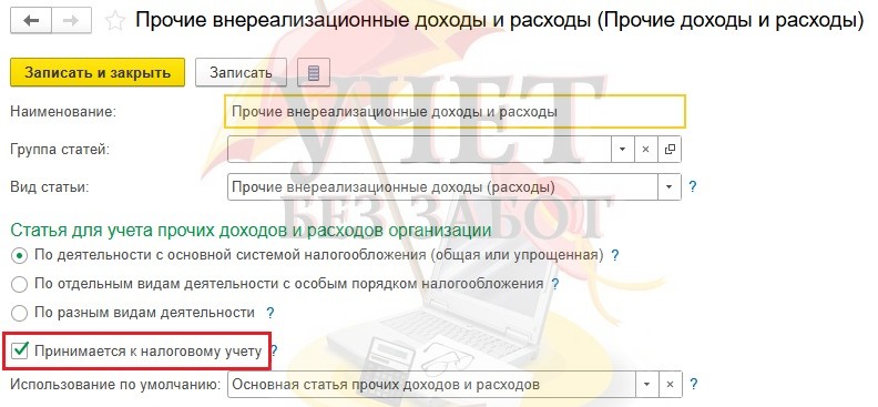 В столбце «Счет затрат» выбираем счет 91.02, субконто прочих доходов и расходов должно быть с галочкой «Принимается к НУ».