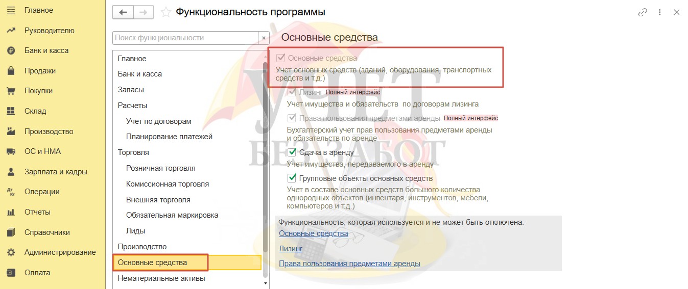 На вкладке «Основные средства» должен быть установлен флаг «Основные средства»,