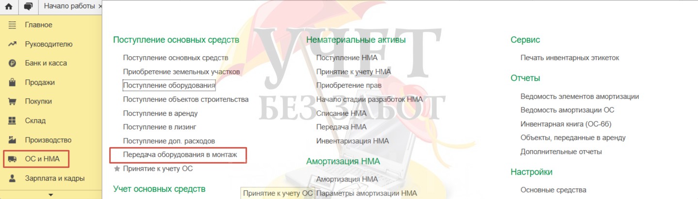 Перейдем в раздел меню «ОС и НМА» и выберем пункт «Передача оборудования в монтаж».