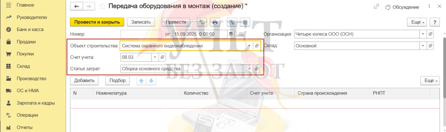 Поступление прослеживаемых основных средств, требующих сборки, на ОСН в 1С: Бухгалтерии предприятия ред. 3.0