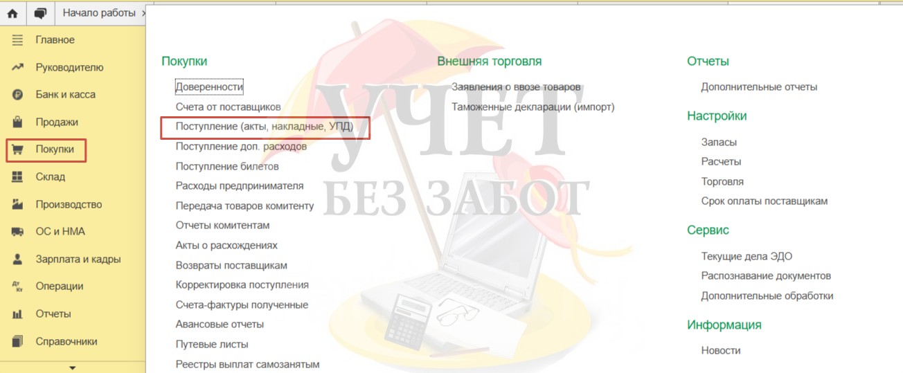 Перейдем в раздел меню «Покупки» - «Поступление (акты, накладные, УПД)»