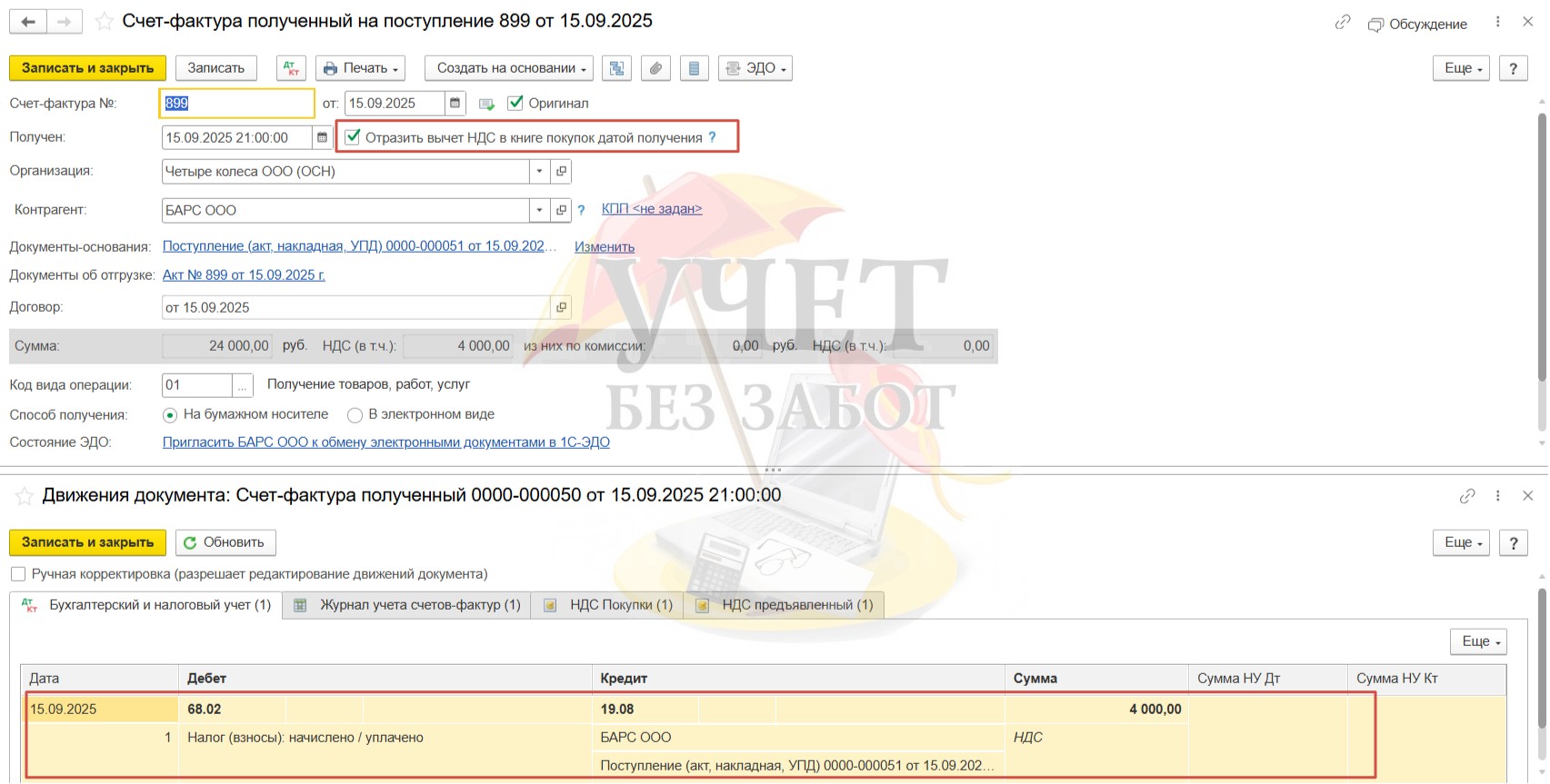 При установленном флаге «Отразить вычет НДС в книге покупок датой получения» в счет-фактуре программа формирует проводку Дт 68.02 Кт 19.08. Вычет НДС по услугам монтажа применён.