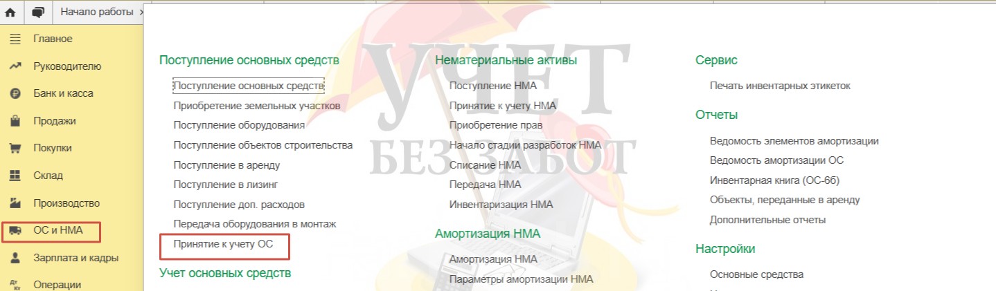 Перейдем в раздел меню «ОС и НМА» и выберем пункт «Принятие к учету ОС».