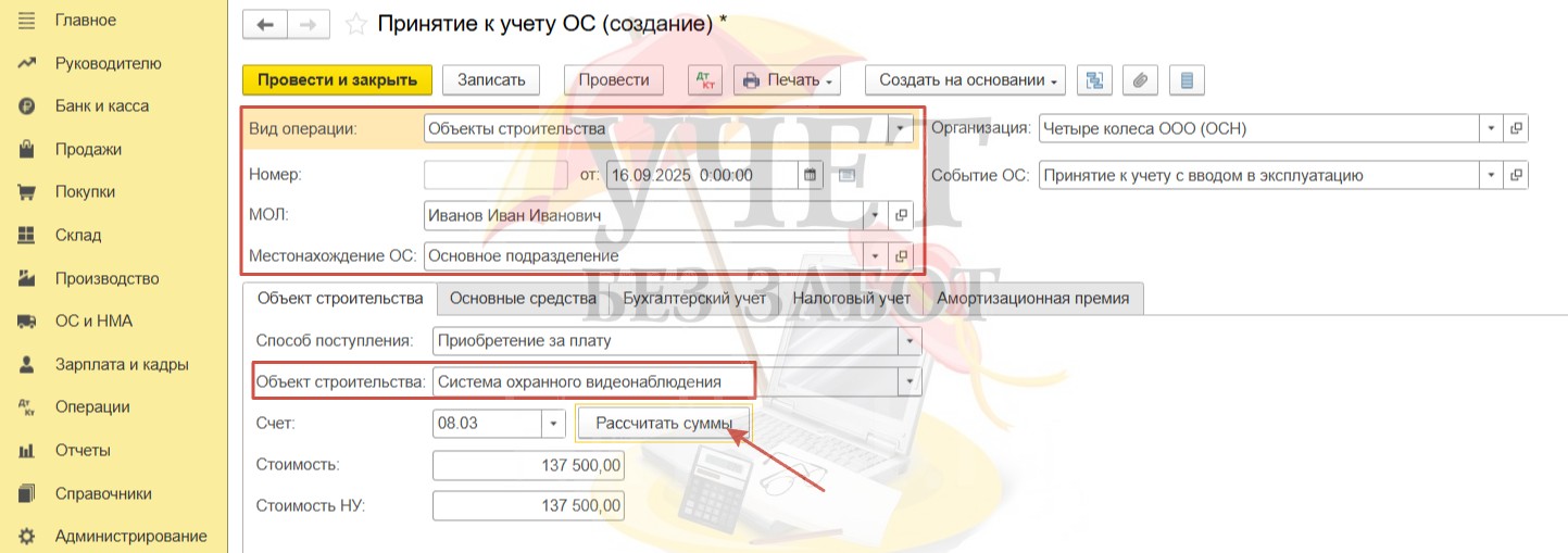 На вкладке «Объект строительства» выберем систему видеонаблюдения. Счет 08.03 установлен программой автоматически. При нажатии на кнопку «Рассчитать суммы» автоматически заполняются строки по стоимости в бухгалтерском и налоговом учете. Это сумма затрат, накопленных на данный момент на счете 08.03.