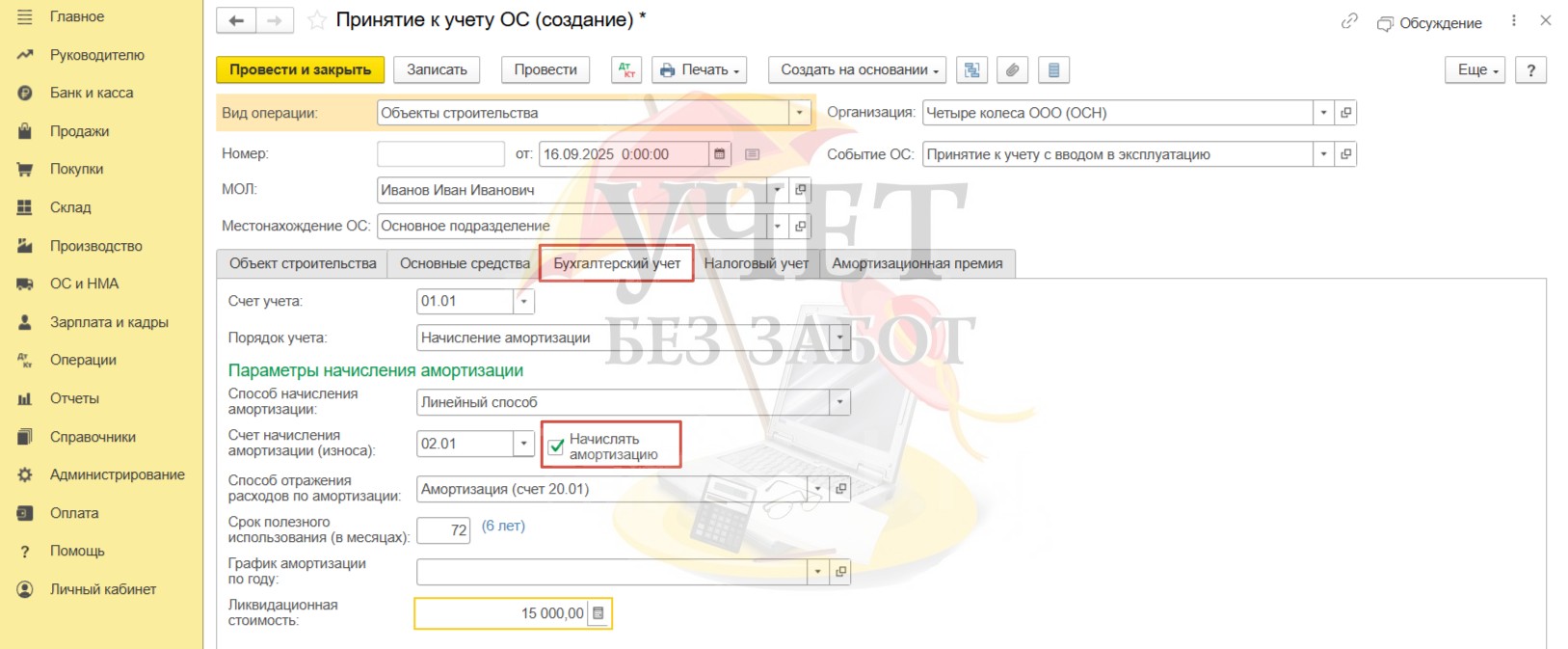 На вкладке «Бухгалтерский учет» должен быть установлен флаг «Начислять амортизацию». Кроме этого, необходимо выбрать счет, на котором будут учтены амортизационные суммы. В нашем случае мы выбрали счет 20, поскольку по условиям примера система видеонаблюдения монтируется в производственном помещении. Значения для полей «Срок полезного использования (в месяцах)» и «Ликвидационная стоимость» выбираются организацией самостоятельно, исходя из принятого решения комиссии.