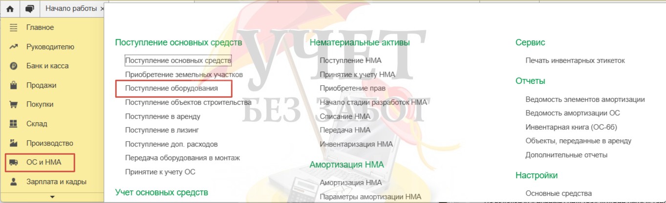 Перейдём в раздел меню «ОС и НМА» и выберем пункт «Поступление оборудования».