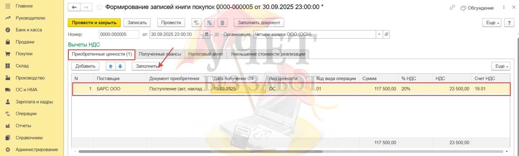 Создадим новый документ «Формирование записей книги покупок». На вкладке «Приобретенные ценности» воспользуемся командой «Заполнить». Программа дополнит документ всеми необходимыми данными для применения вычета НДС.