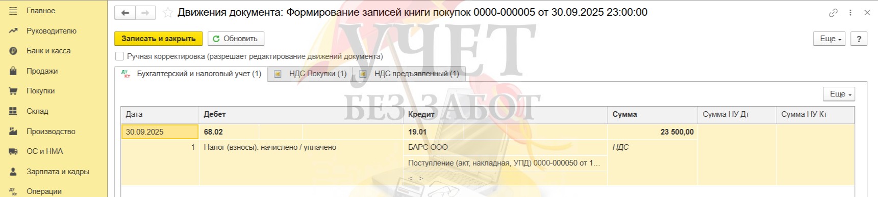 После проведения документа проверим корректность сформированной проводки. Все верно.
