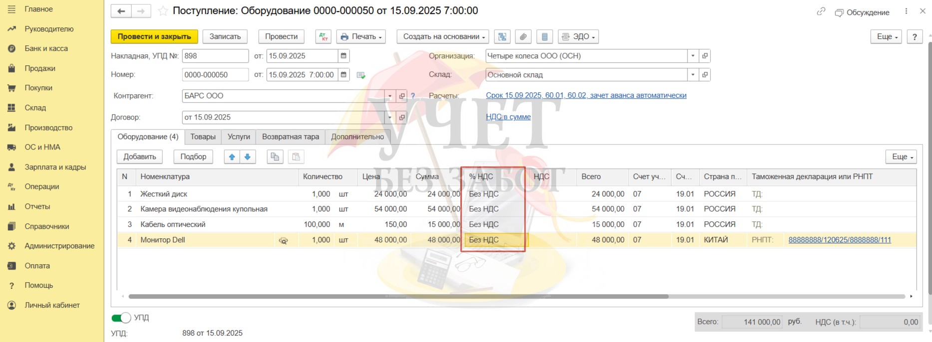 Теперь давайте предположим, что наш поставщик не является плательщиком НДС.