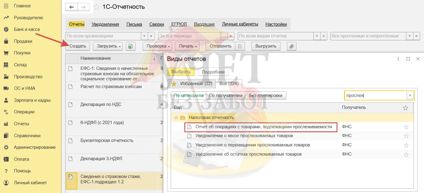 После нажатия на кнопку «Создать» в открывшемся окошке следует выбрать «Отчет об операциях с товарами, подлежащими прослеживаемости».