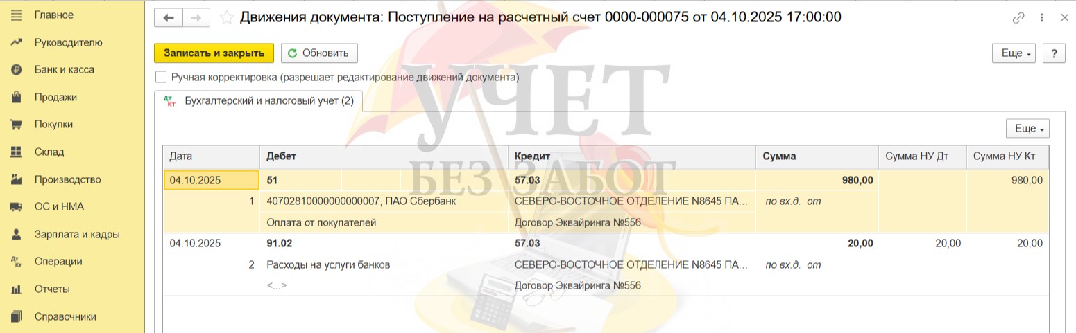04.10.2025 – оплата поступила от банка-эквайера на расчётный счёт организации.
