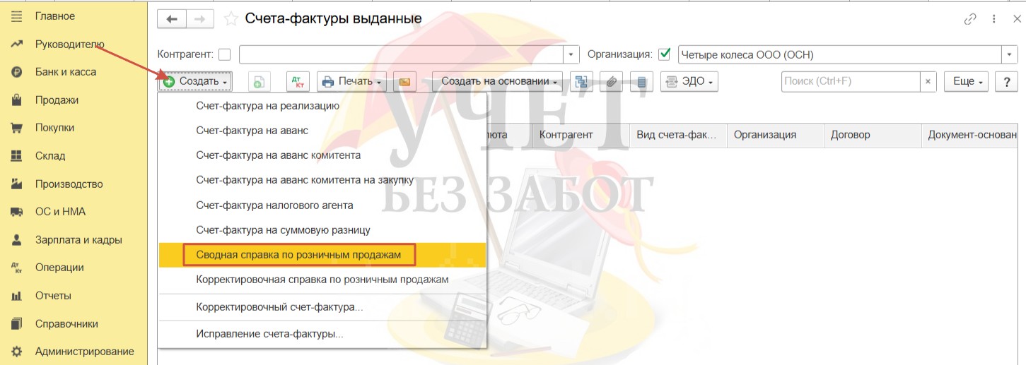 Перейдем в раздел меню «Продажи» - «Счет фактуры выданные». Воспользуемся командой «Создать» и выберем документ «Сводная справка по розничным продажам».