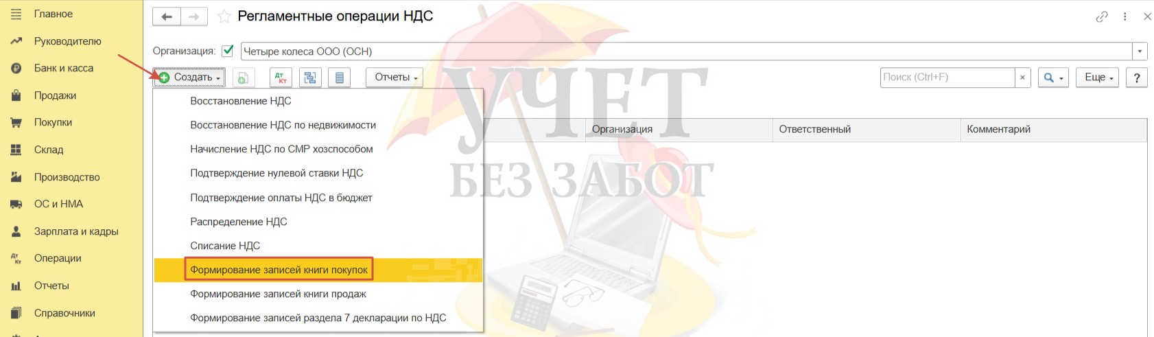 Перейдем в раздел меню «Операции» - «Регламентные операции НДС». Создадим новый документ «Формирование записей книги покупок».
