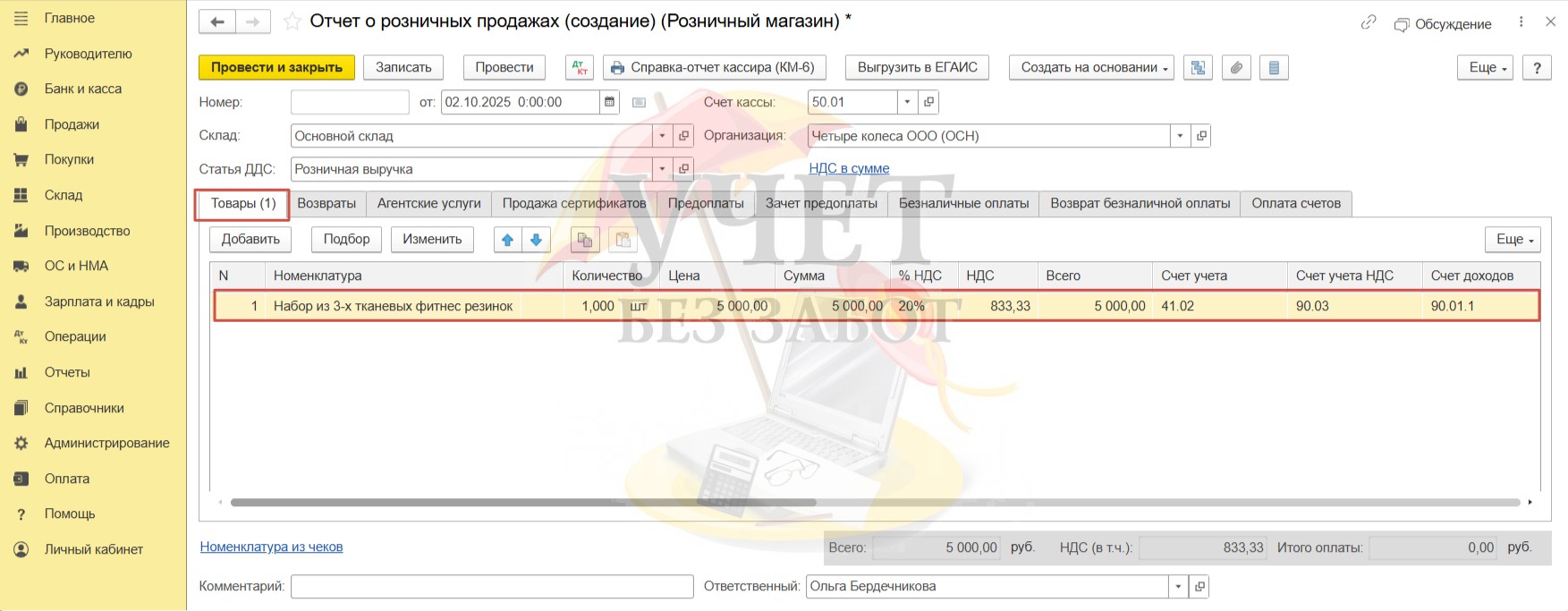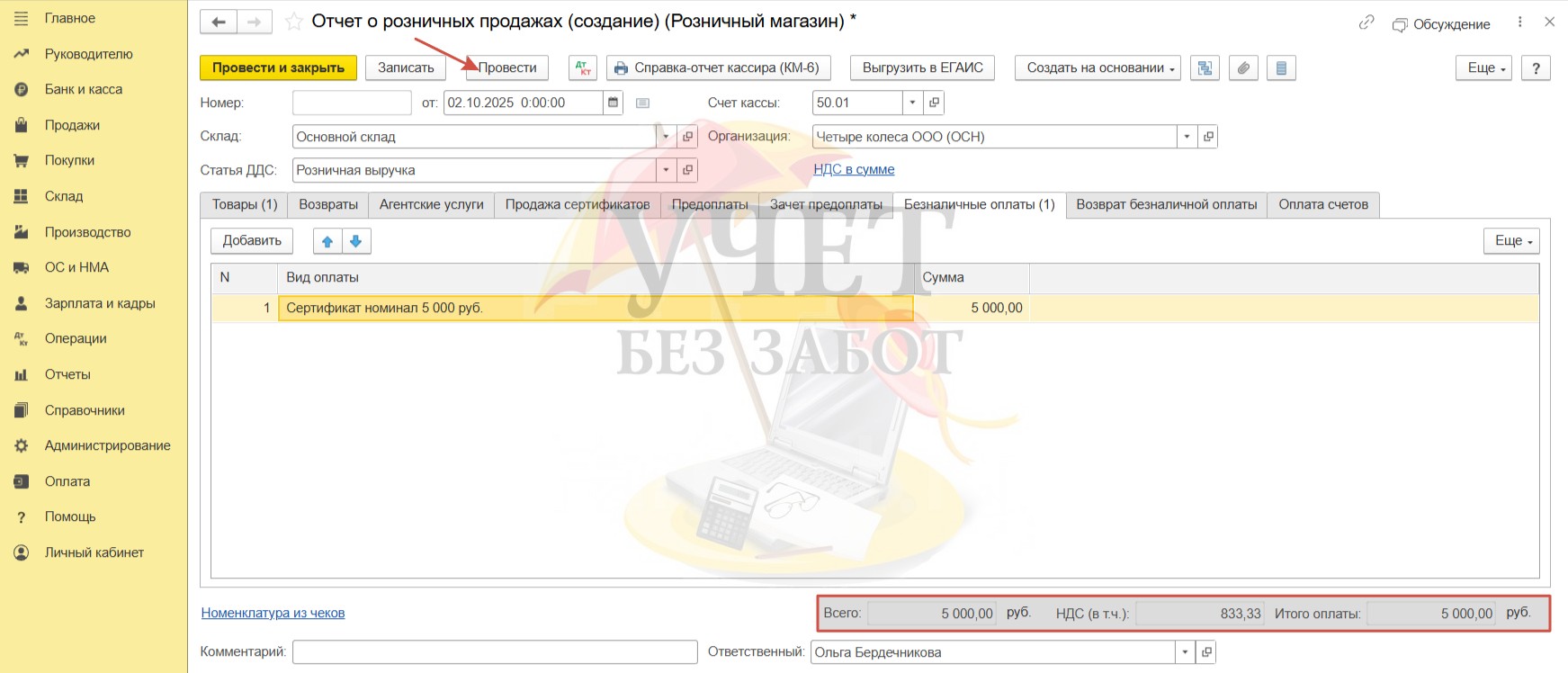 02.10.2025 – покупатель приобрёл товары на сумму 5 000 руб. (в т.ч. НДС – 833 руб. 33 коп.); в качестве оплаты был предъявлен подарочный сертификат номиналом 5 000 руб.;