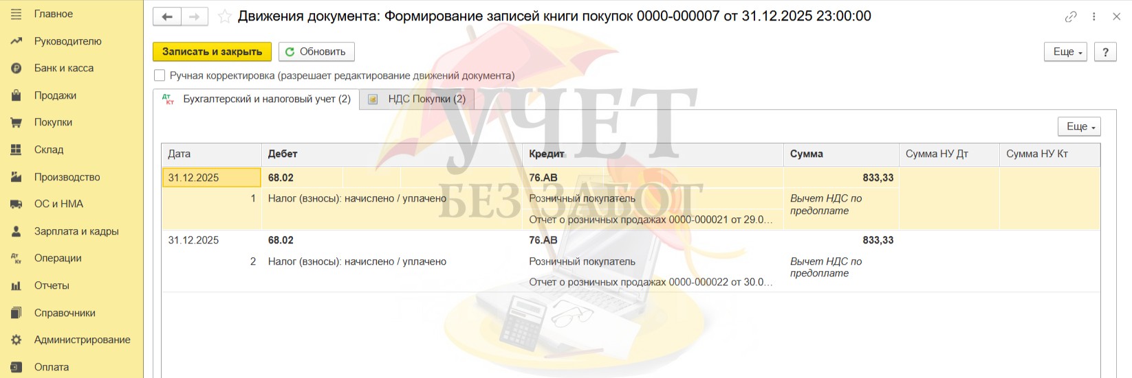 Видим, что при проведении документа сформированы проводки, свидетельствующие о применении вычета по НДС.