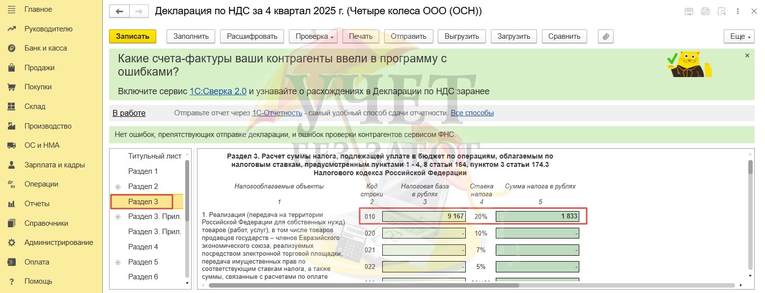 Сумма реализации товаров без учёта НДС и сумма налога, исчисленная с продаж, отражена по строке 010 раздела 3.