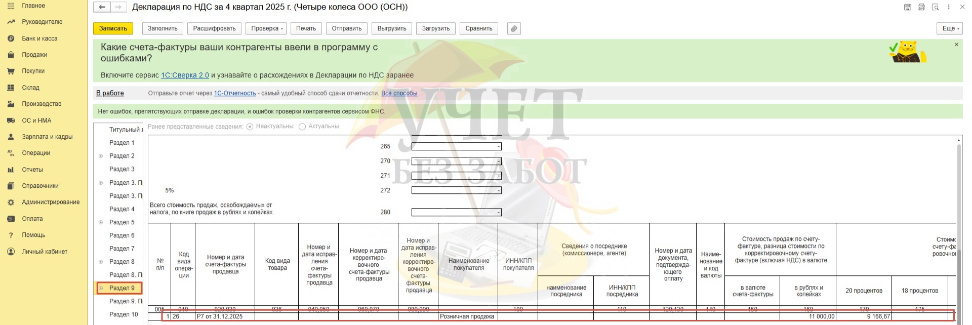 Программа автоматически заполнит сводные данные о сумме розничных продаж и исчисленном при реализации НДС. Кроме этого, установлен корректный код вида операции «26», который применяется при осуществлении продаж физическим лицам. Для сохранения данных нажмём «Записать и закрыть».