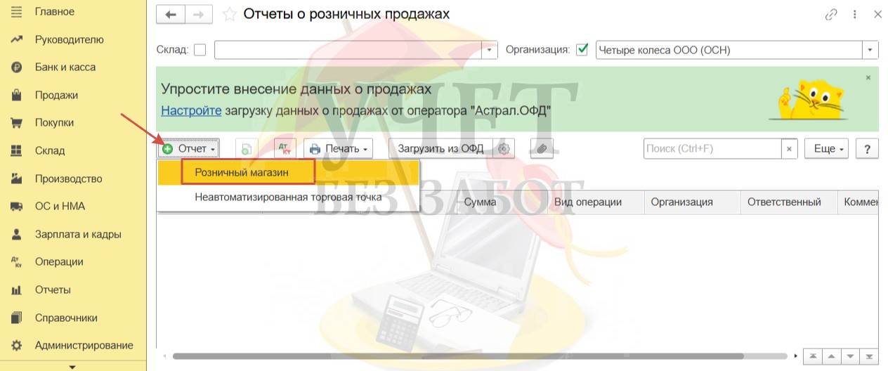 Вернёмся в раздел меню «Продажи» - «Отчеты о розничных продажах». Зарегистрируем ещё один отчет с видом «Розничный магазин».