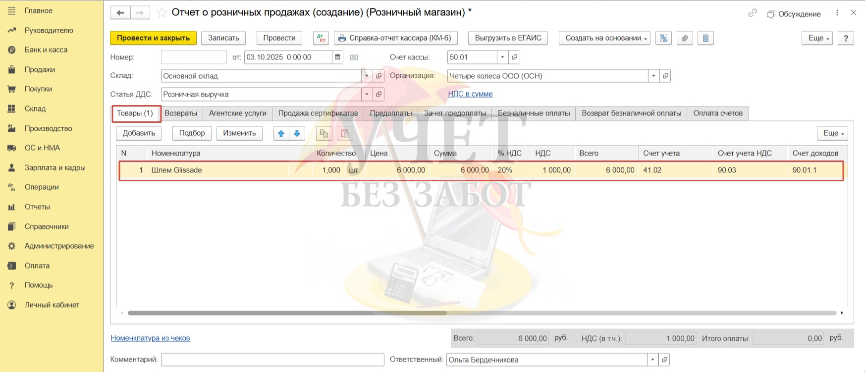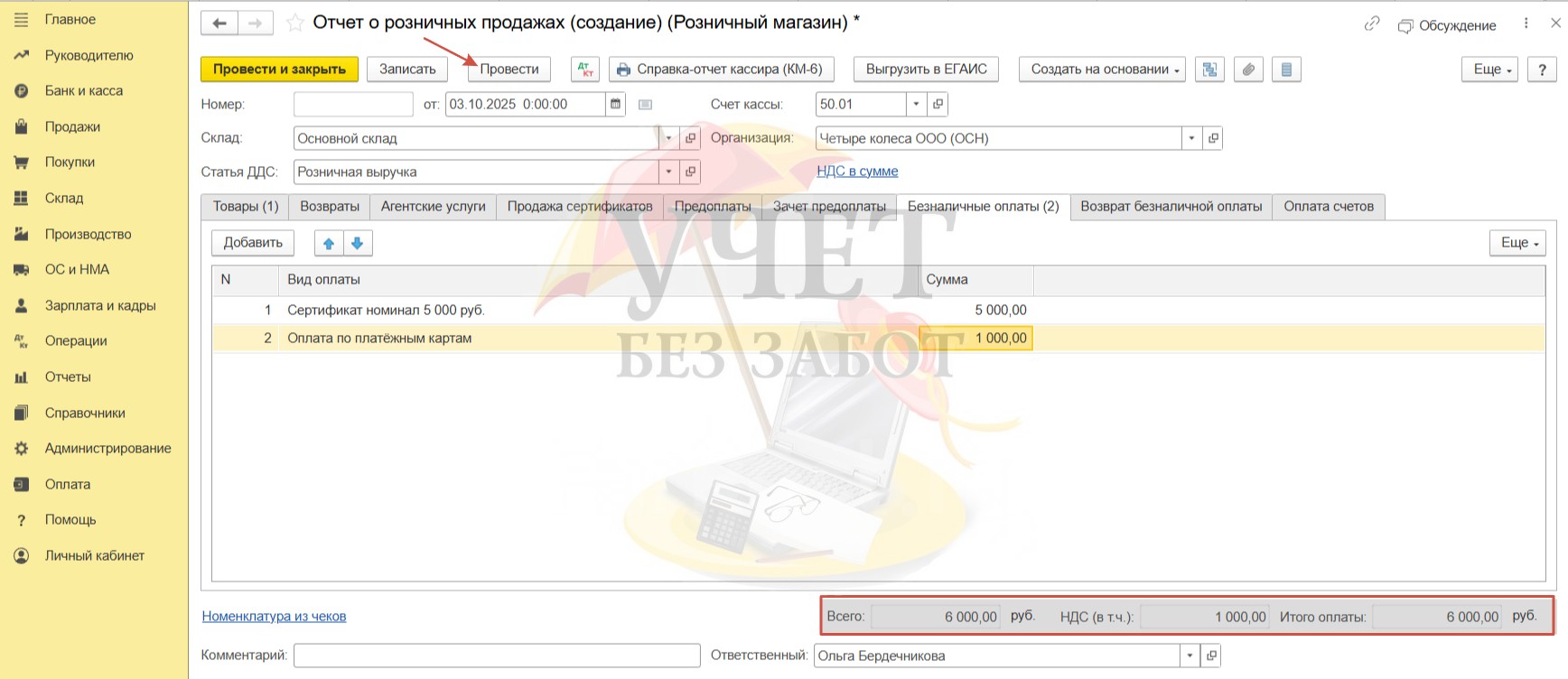 03.10.2025 – покупатель приобрёл товары на сумму 6 000 руб. (в т.ч. НДС – 1 000 руб.); в качестве оплаты был предъявлен подарочный сертификат номиналом 5 000 руб.; доплата суммы в размере 1 000 руб. была произведена платёжной картой;