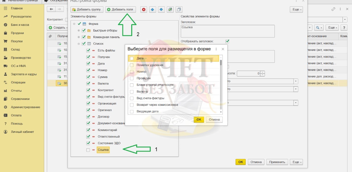 Встаем на самый нижний элемент «Ссылка» и нажимаем «Добавить поля»: