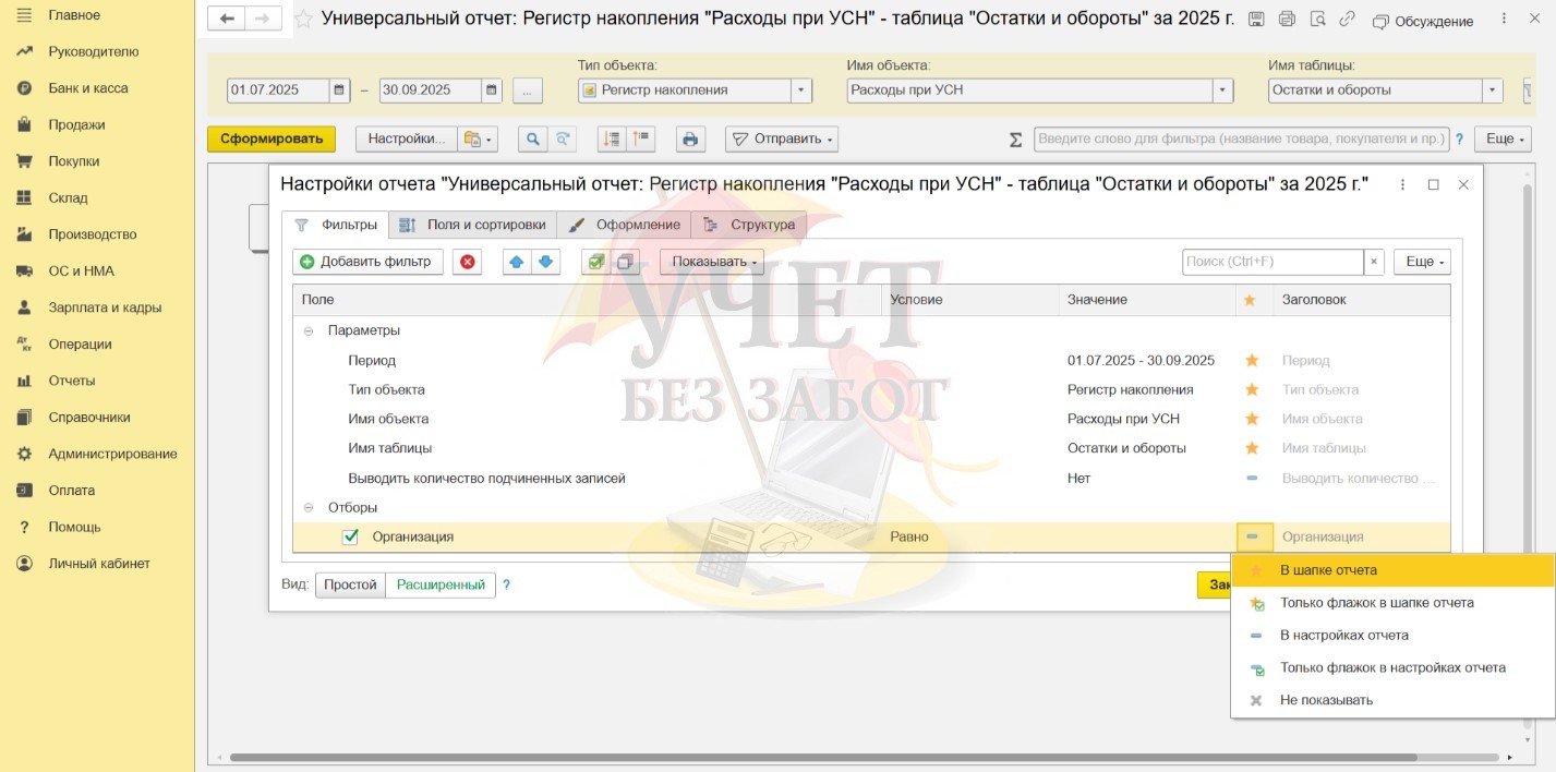 1. Организация (если учет ведется по нескольким организациям). Равно- организация, по которой нужно сформировать данные. Способ вывода отбора- звездочка, чтобы показать в шапке отчета. Чтобы поставить звездочку, нажмите левой клавишей мыши два раза по голубой полоске перед значением организации и выберете «В шапке отчета»: