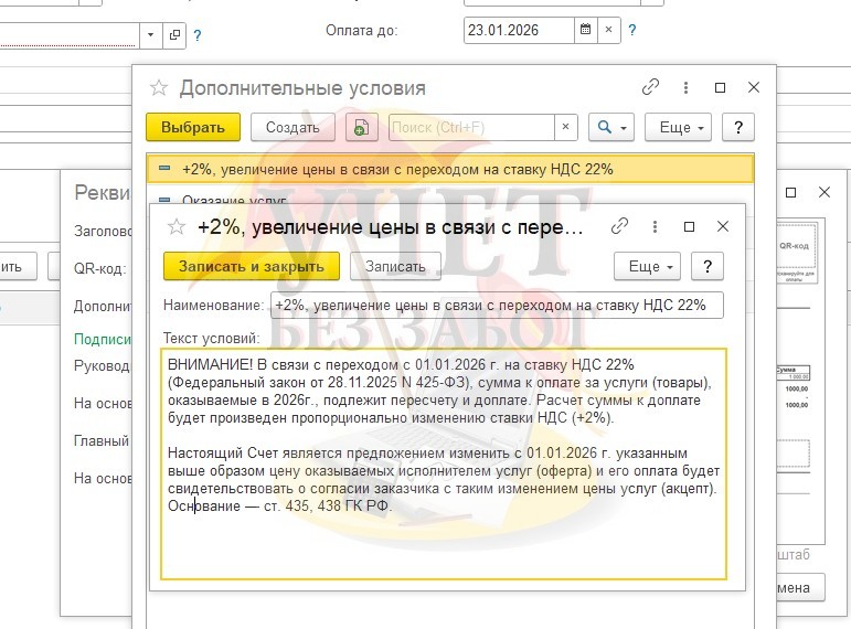 При выборе созданного дополнительного условия, в печатной форме счета появляется информация.