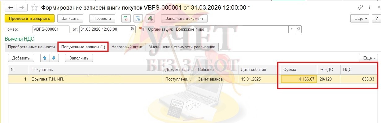 Примите исчисленный НДС с аванса к вычету в разделе «Меню» - «Операции по НДС», далее кнопка «Создать» - «Формирование записей книги покупок».