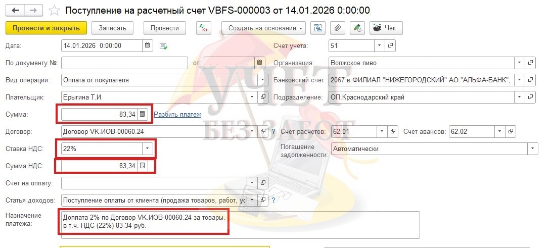Обратите внимание, если доплата перечисляется в 2026 г., она не признается дополнительной оплатой стоимости товаров, с которой необходимо исчислить НДС по ставке 22/122, а считается непосредственной доплатой налога. Продавец выставляет корректировочный счет-фактуру на разницу в виде суммы доплаты налога. На основании этого документа покупатель принимает к вычету НДС в размере 2%. Поэтому сумма документа равна сумме НДС (22%) в документе «Поступление на расчетный счет».