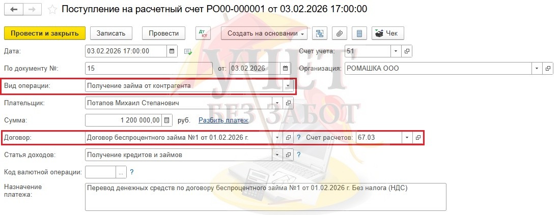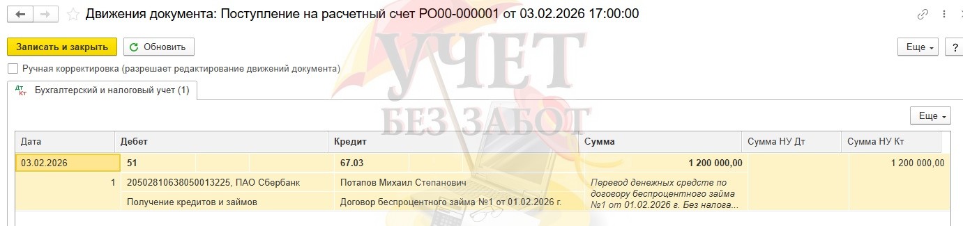 Получение беспроцентного займа от учредителя в 1С: Бухгалтерии предприятия 8