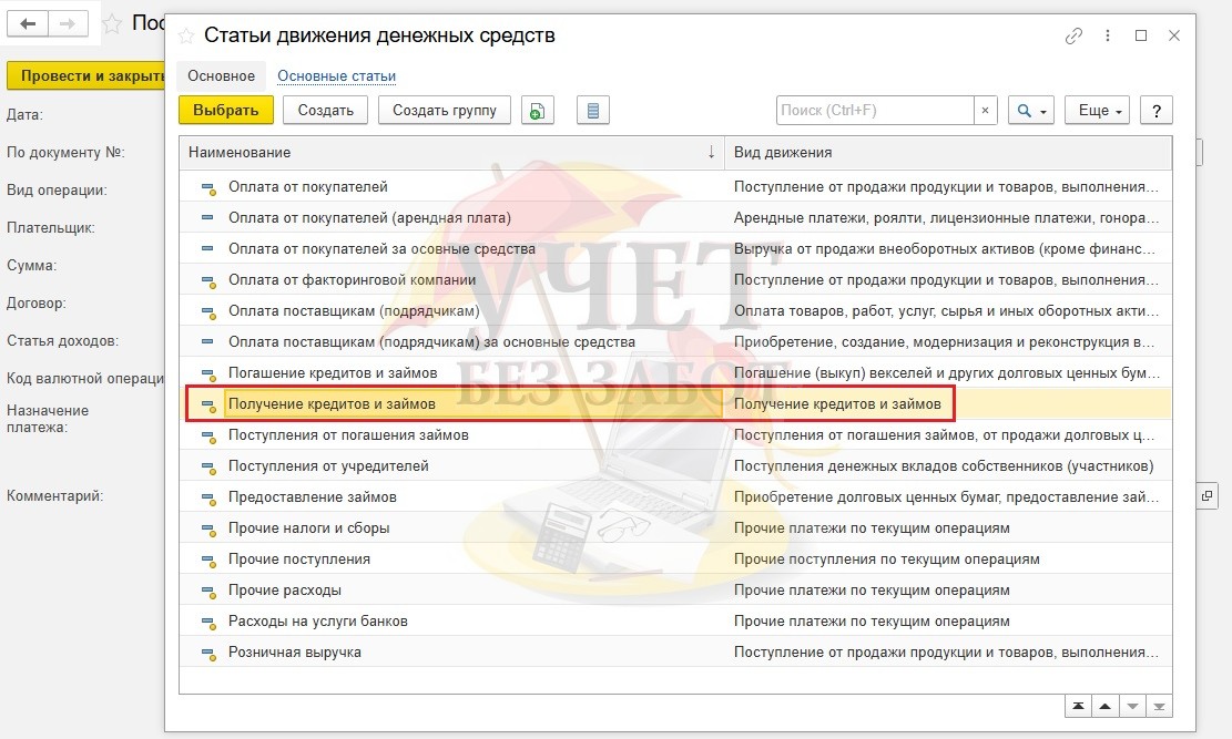 Также важно выбрать статью доходов «Получение кредитов и займов» для корректного заполнения бухгалтерской отчетности.