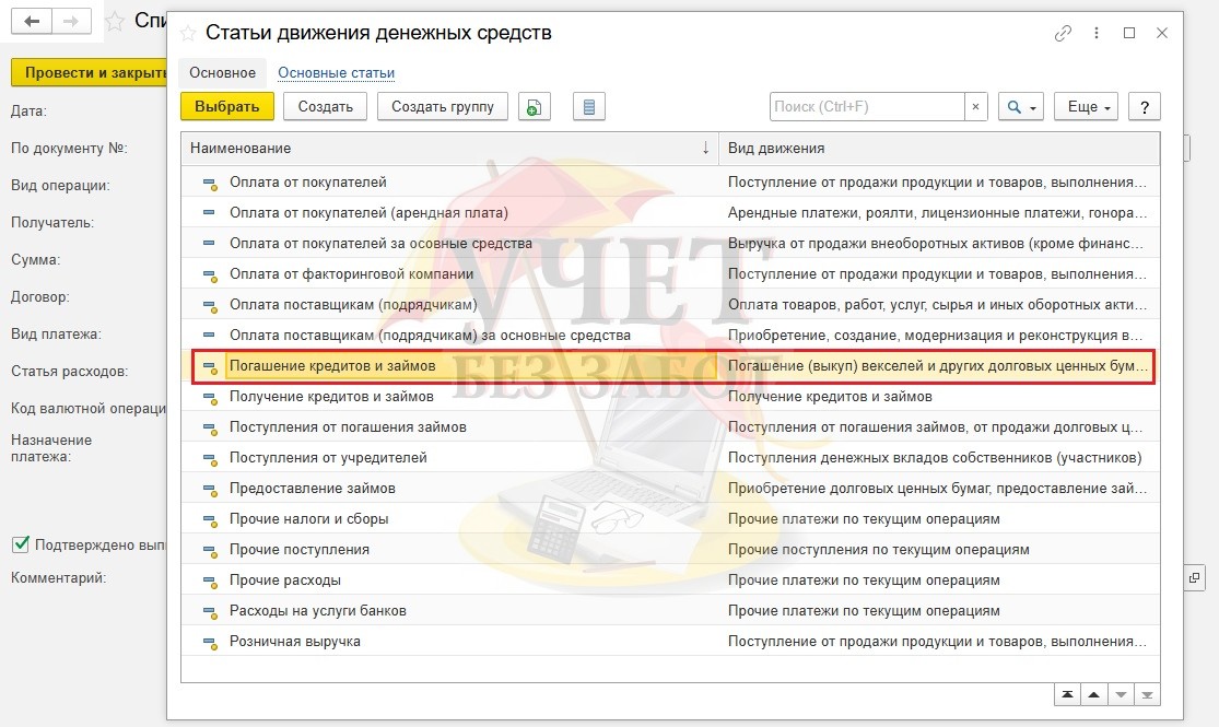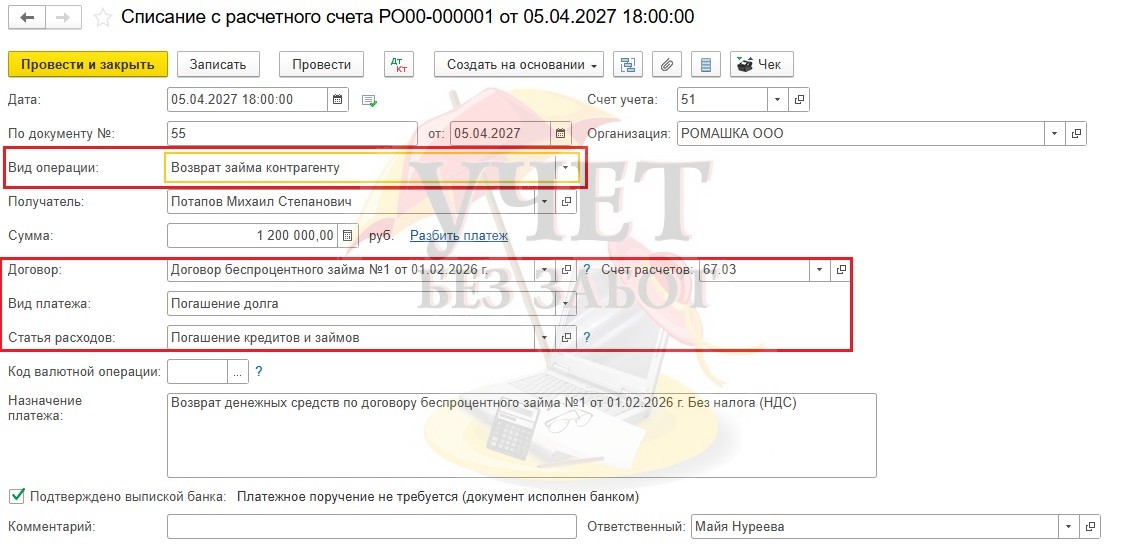 Помним, что для правильной бухгалтерской отчетности нам нужно выбрать верное значение в строке «Статья расходов», и это будет «Погашение кредитов и займов»: