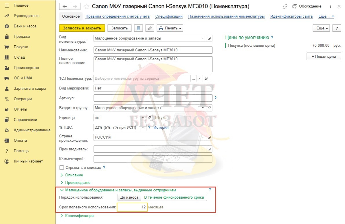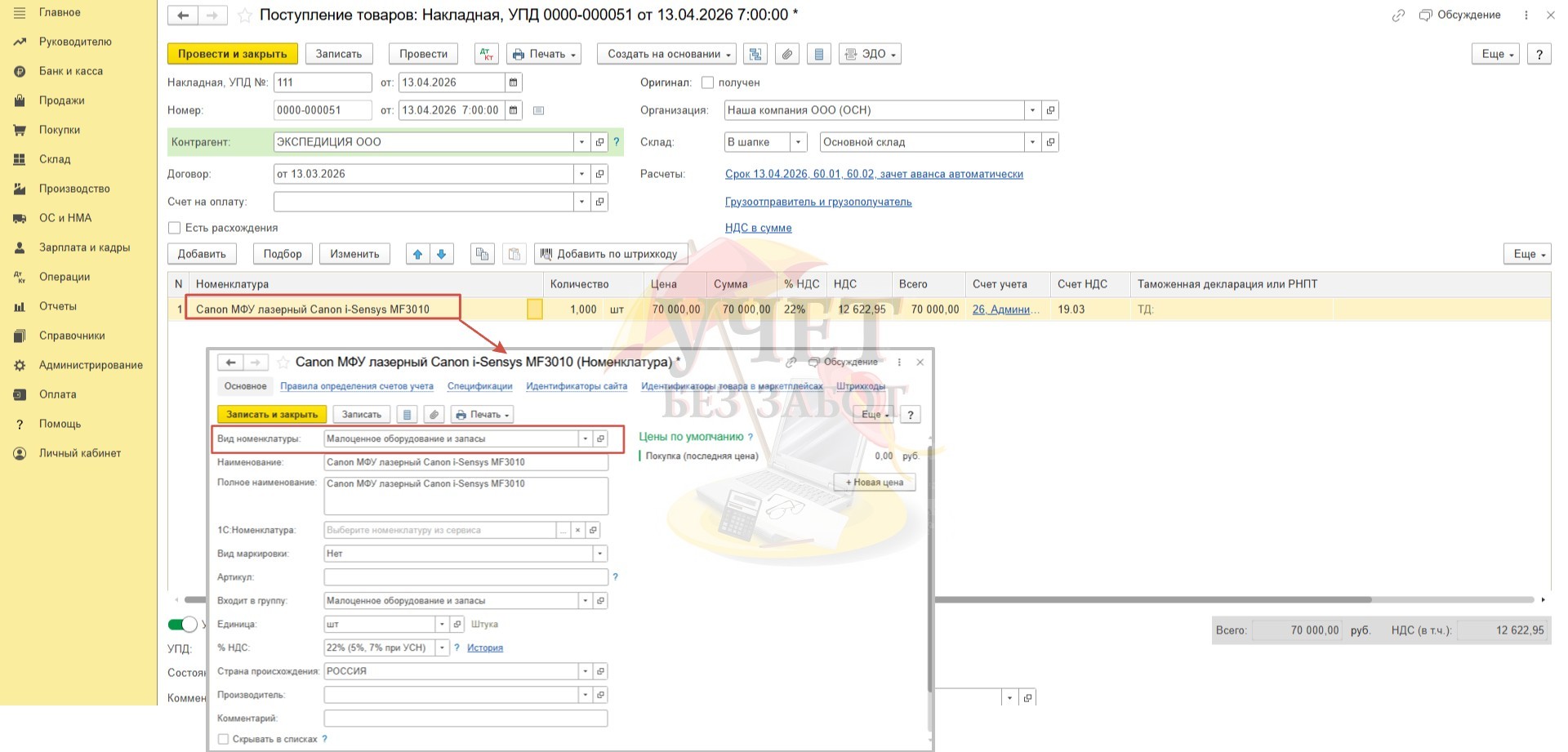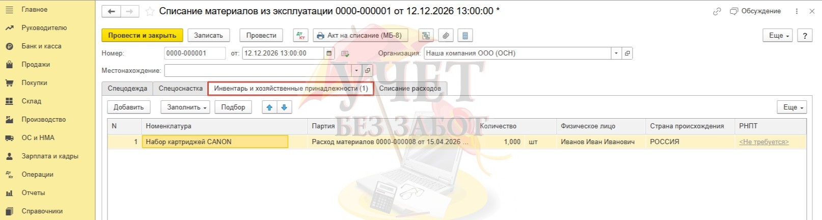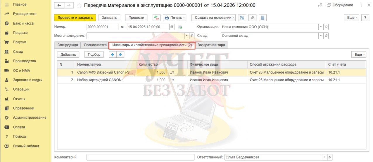 Обратите внимание, что для корректного поведения программы важно установить верный вид номенклатуры «Малоценное оборудование и запасы».