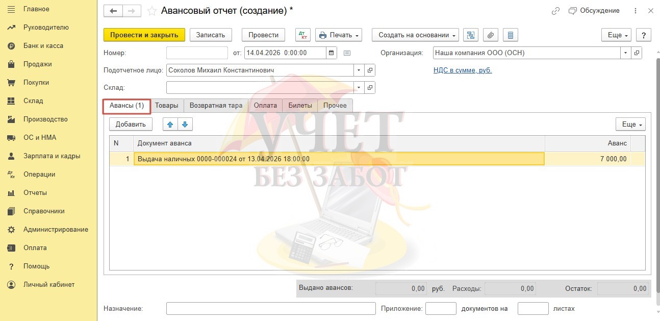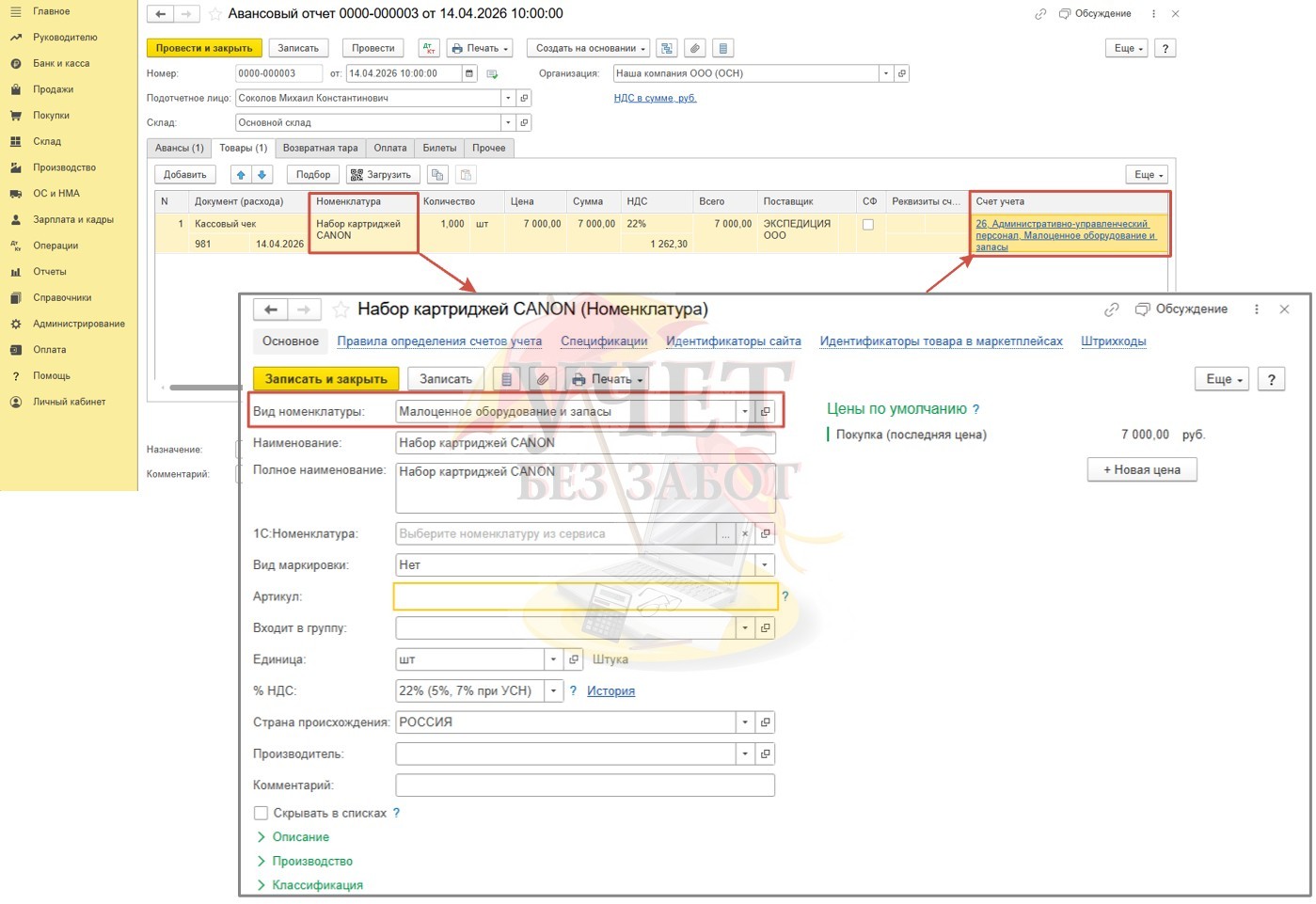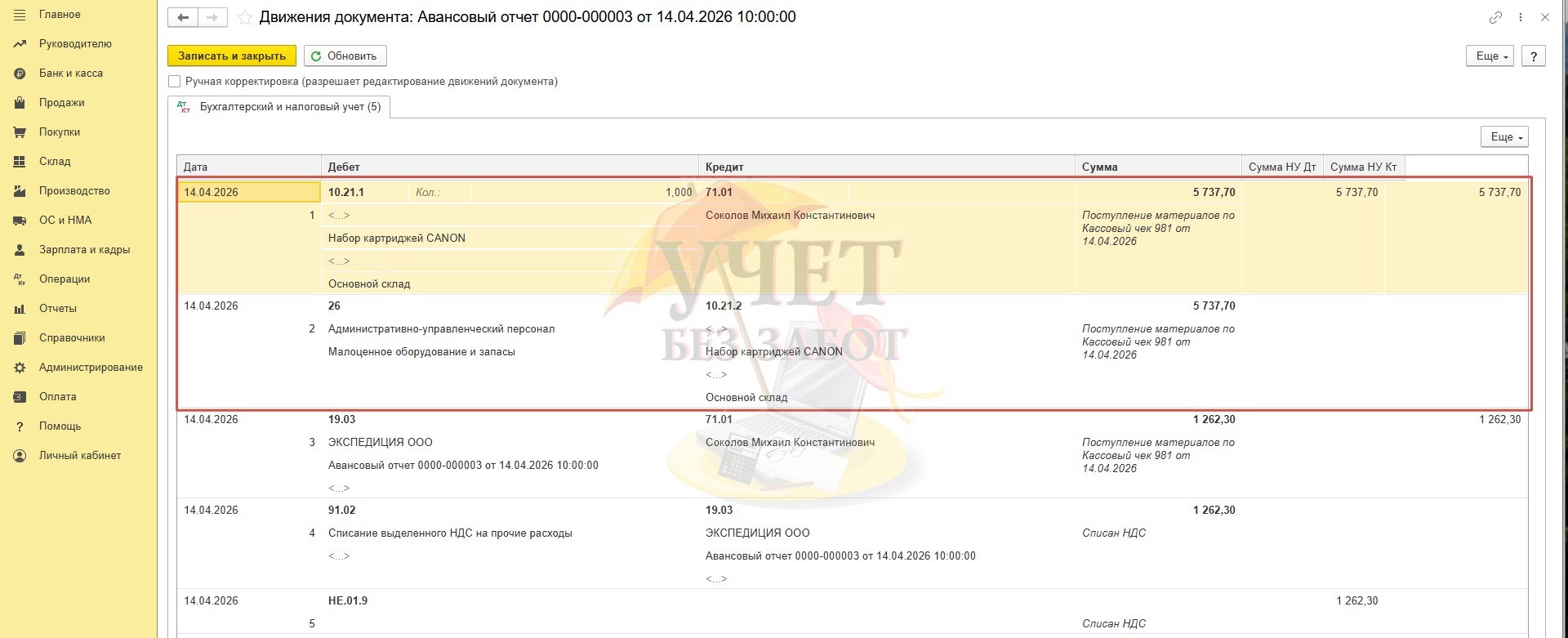 14.04.2026г – через подотчетное лицо приобретен комплект картриджей для МФУ стоимостью 7 000 руб. (в т.ч. НДС – 1 262 руб. 30 коп.);