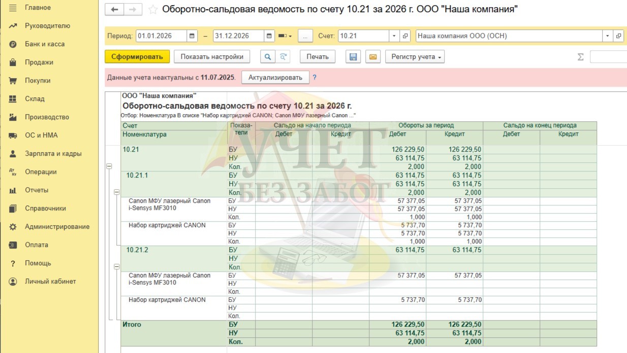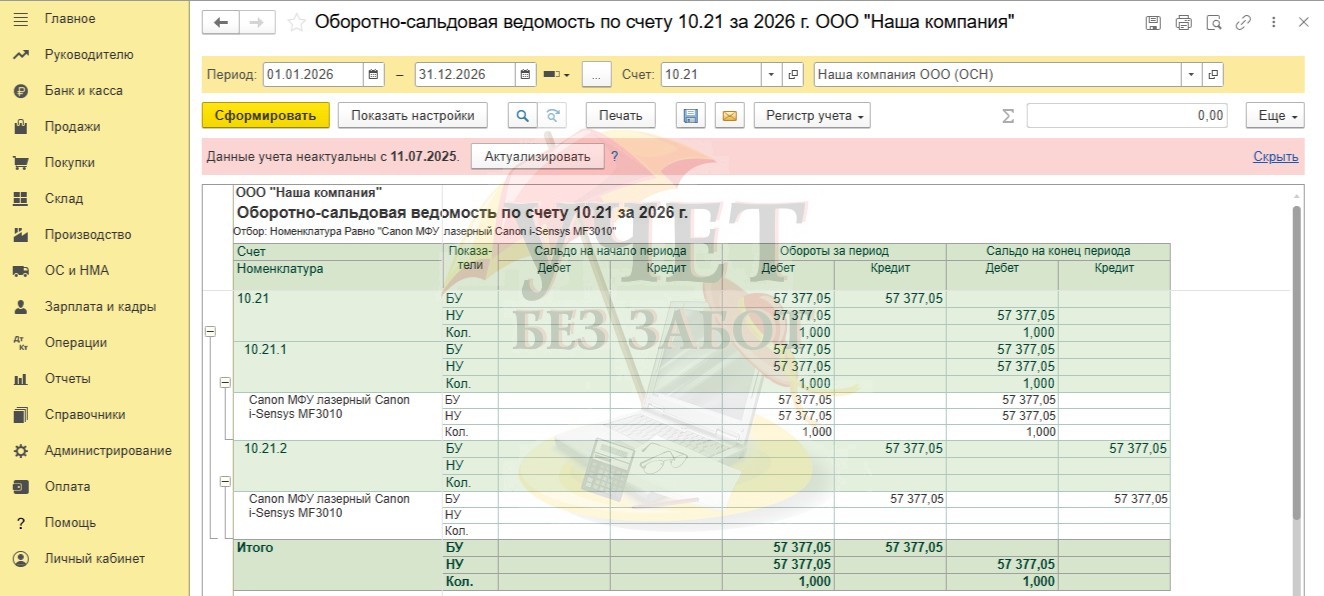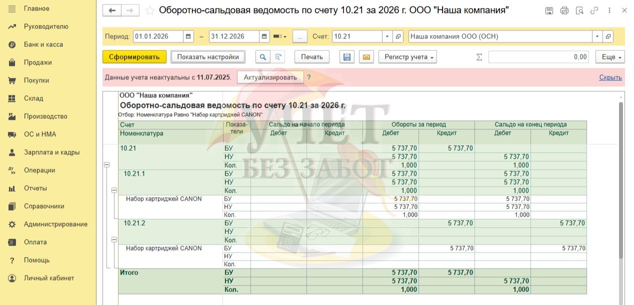 Сформируем еще раз оборотно-сальдовую ведомость по счету 10.21. После проведения вышеуказанных операций сальдо отсутствует. Все верно.