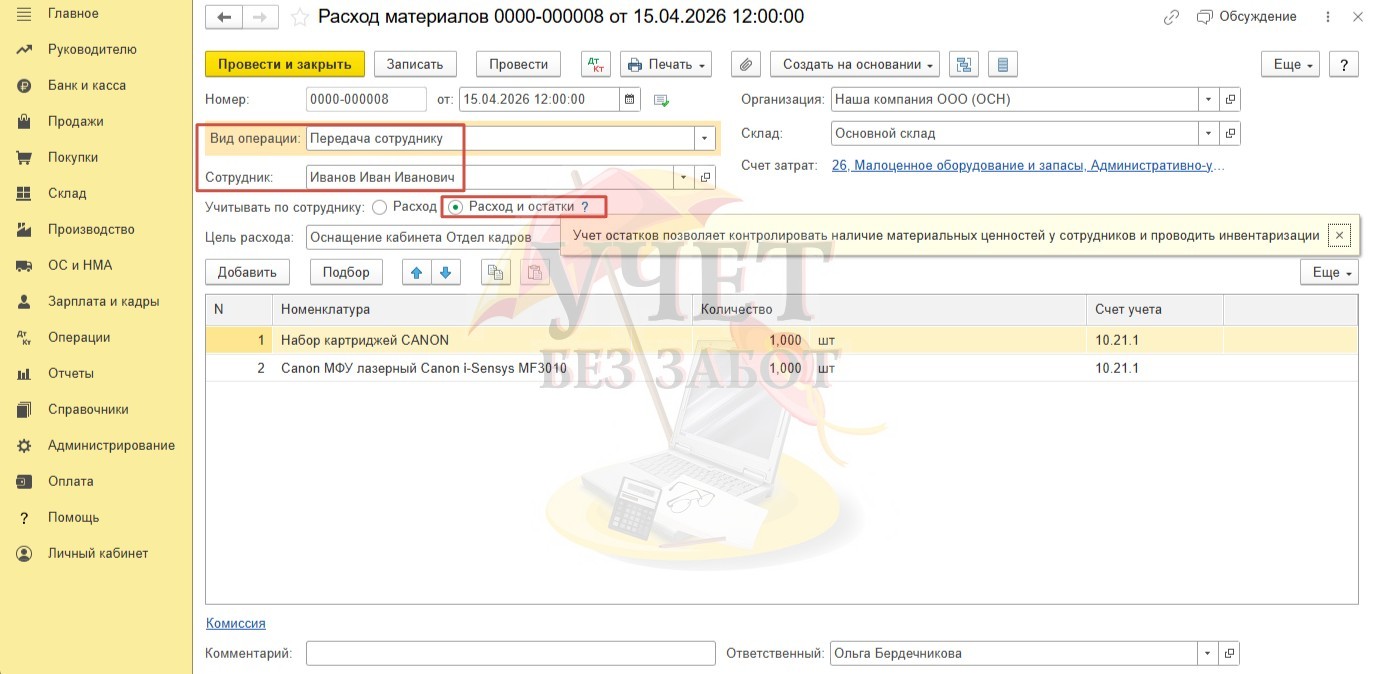 В поле «Вид операции» выберем вариант «Передача сотруднику». Ниже выберем ответственное лицо и установим переключатель для значения «Расход и остатки». При такой настройке оборудование будет списано со счета 10.21, а после этого учтено на забалансовом счете МЦ.04.