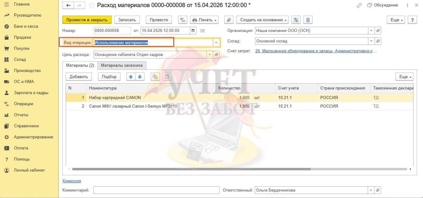 (Если в вашем случае контроль за запасами не нужен, можно выбрать вид операции «Использование материалов». В этой ситуации в проводках счет МЦ.04 участвовать не будет.)