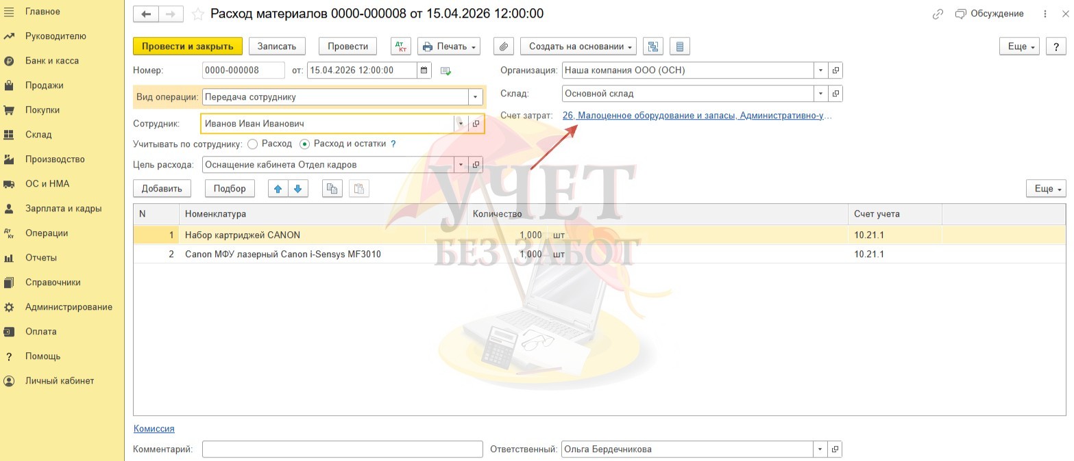 Нужно учесть, что мы имеем дело с дорогостоящим оборудованием, поэтому нам важно не просто списать его, но еще и обеспечить дополнительный контроль после передачи в эксплуатацию. В данном документе есть особая настройка, при использовании которой в дальнейшем можно будет отследить наличие материальных ценностей у сотрудника. Давайте посмотрим, как работает эта настройка.